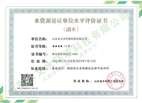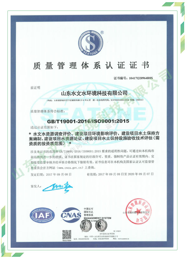 公司擁有水利工程設(shè)計(jì)、水土保持、水文水資源調(diào)查評(píng)價(jià)、水資源論證、建設(shè)項(xiàng)目環(huán)境影響評(píng)價(jià)、市政公用工程施工總承包、水利水電工程施工總承包、電子與智能化工程專業(yè)承包等資質(zhì),2017年通過質(zhì)量管理體系、環(huán)境管理體系、職業(yè)健康安全管理體系認(rèn)證;2020年被評(píng)為國家級(jí)高新技術(shù)企業(yè),同年被中國水利企業(yè)協(xié)會(huì)推薦為第一批“合同節(jié)水服務(wù)企業(yè)”;2021年被山東省、濟(jì)南市評(píng)為 “專精特新”中小企業(yè)。業(yè)務(wù)范圍涉及水利工程設(shè)計(jì);節(jié)水設(shè)計(jì)、改造、水平衡測試;山洪災(zāi)害調(diào)查;城市水資源調(diào)查評(píng)價(jià);建設(shè)項(xiàng)目水土保持方案編制、監(jiān)測、驗(yàn)收、水土保持規(guī)劃;水安全保障規(guī)劃、建設(shè)項(xiàng)目水資源論證、規(guī)劃水資源論證;建設(shè)項(xiàng)目環(huán)境影響評(píng)價(jià);入河排污口論證;防洪影響評(píng)價(jià);市政公用工程施工、水利水電工程施工、電子與智能化工程施工等。